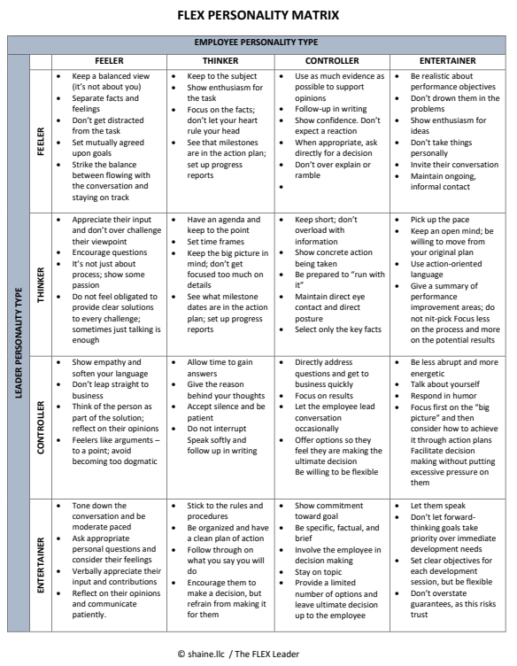 The FLEX Personality Matrix is a powerful tool that outlines how leaders can adjust or “flex” their personality when providing feedback to employees with differing personality traits. By recognizing that each individual falls into one of the four categories—Feeler, Thinker, Controller, or Entertainer—you can tailor your approach to resonate more effectively with each person. This adaptability not only makes feedback more digestible but also creates a more supportive, engaged, and ultimately higher-performing team.